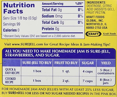 Add pectin mixture gradually to fruit, stirring vigorously. Sure jell premium fruit pectin for homemade jams and jellies, 100% natural 1.75 oz (2 packs) $8.57($2.45 / 1 ounce) in stock. How much pectin is in a packet of sure jell? Finely chop or grind fruit. Free shipping on orders over $25.00. Fill jars quickly to ½ of top. This dry pectin is made with a great formula, ensuring you can create the best jams and jellies for your family. Simply mix this powdered fruit pectin into traditional cooked or quick freezer jams to help your preserves thicken for the perfect set. Simply mix this powdered fruit pectin into traditional cooked or quick freezer jams to help your preserves thicken for the perfect set. For the most part, though, it's meant to be used as a less sugar needed pectin, rather than as a no sugar needed pectin. Sure jell sure jell light pectin. This pectin is also sugar and fat free per serving. Remove seeds from 1 gallon.